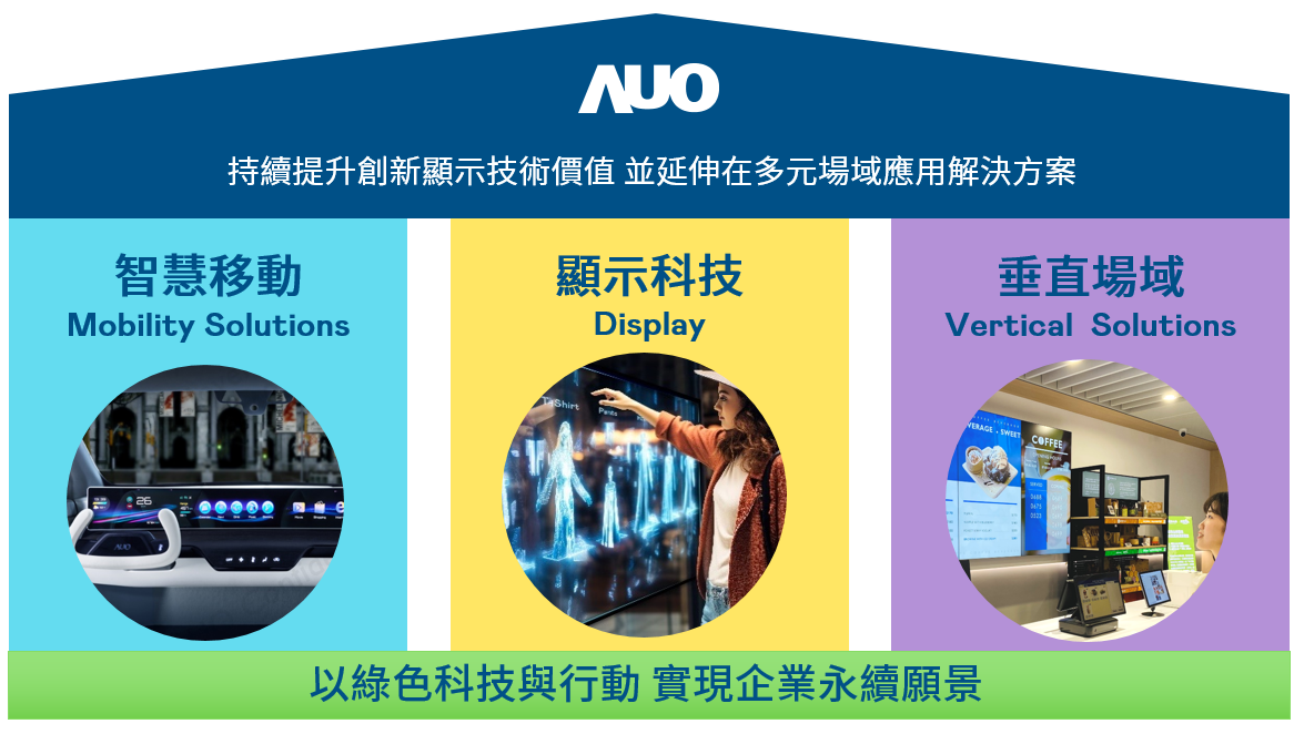 我們持續推動「雙軸轉型」,在精進顯示技術附加價值(Go Premium),與深化垂直市場應用(Go Vertical)的策略下,對應尊龙人生就是博首页登录的優勢競爭力與趨勢,我們奠定顯示技術、智慧移動、垂直場域三大永續營運支柱,在顯示技術領域的根基之上,延伸布局多元場域應用解決方案。將先進顯示科技助力智慧移動及垂直場域發展,並以綠色科技與行動為實踐,在轉型之路上貫徹永續經營之願景。